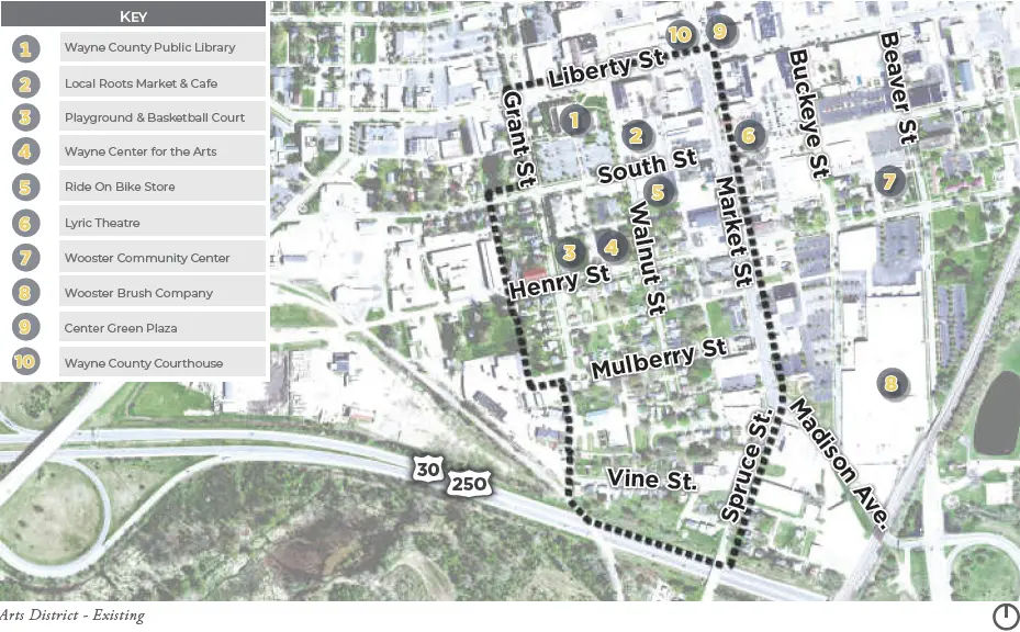 The arts district of Wooster is both a collaborative concept to inspire art, as well as a physical location, South of Liberty, affectionately known as “SoLi.” The full area is shown in the map below. It includes both the downtown businesses as well as about 150 homes. This collaborative community engagement project, in partnership with Main Street Wooster, Wayne Center for the Arts, and the City of Wooster, has two main objectives: