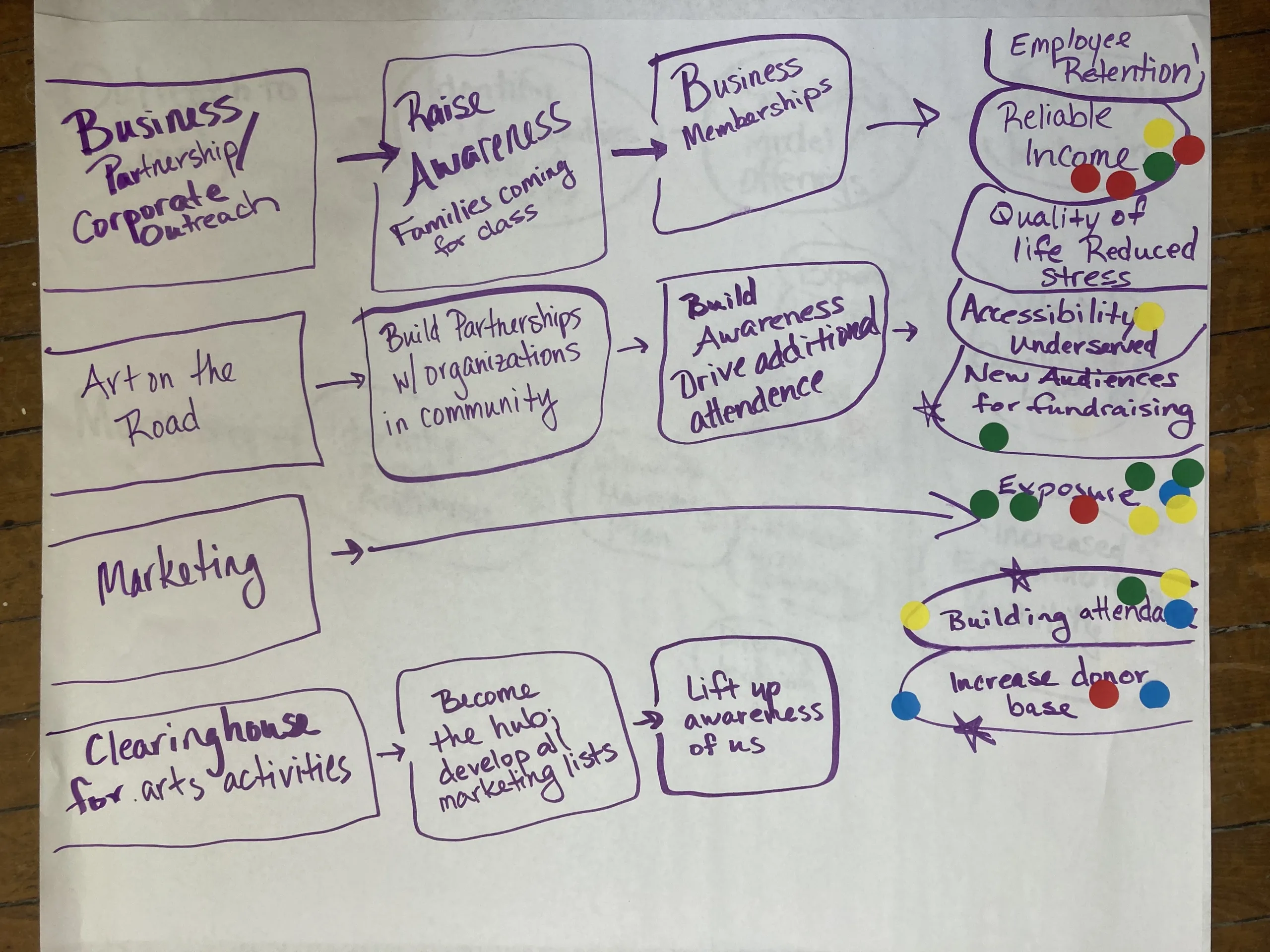 Photo. From a goal setting retreat, a series of sketches of result chains eventually can be used as elements in your Theory of Change.